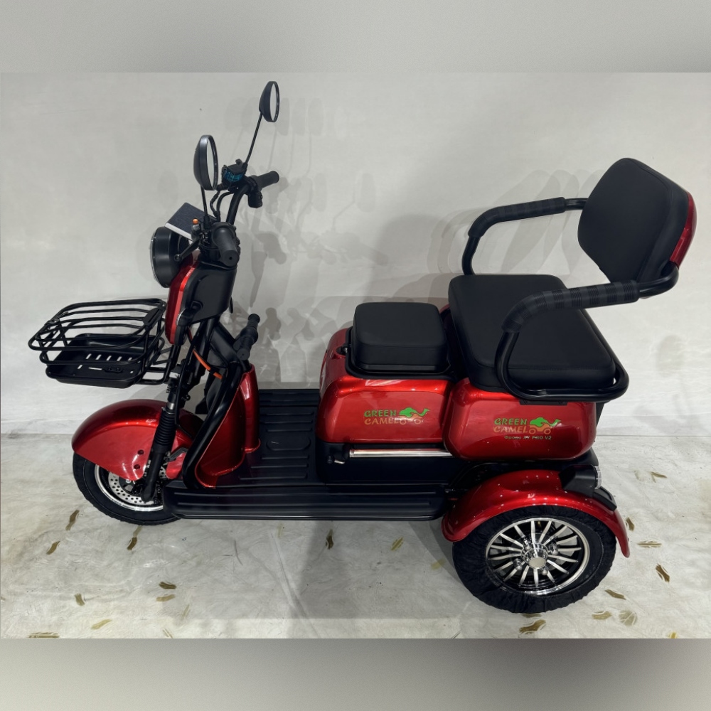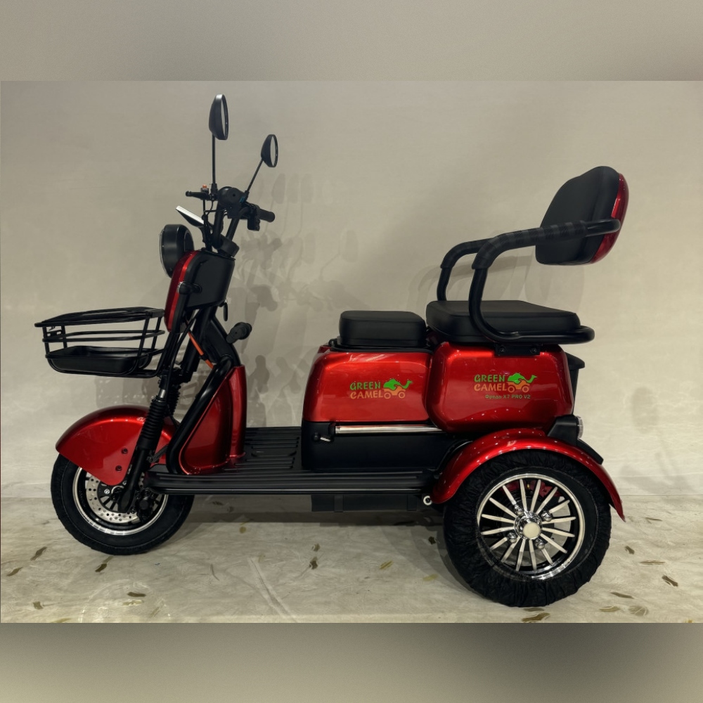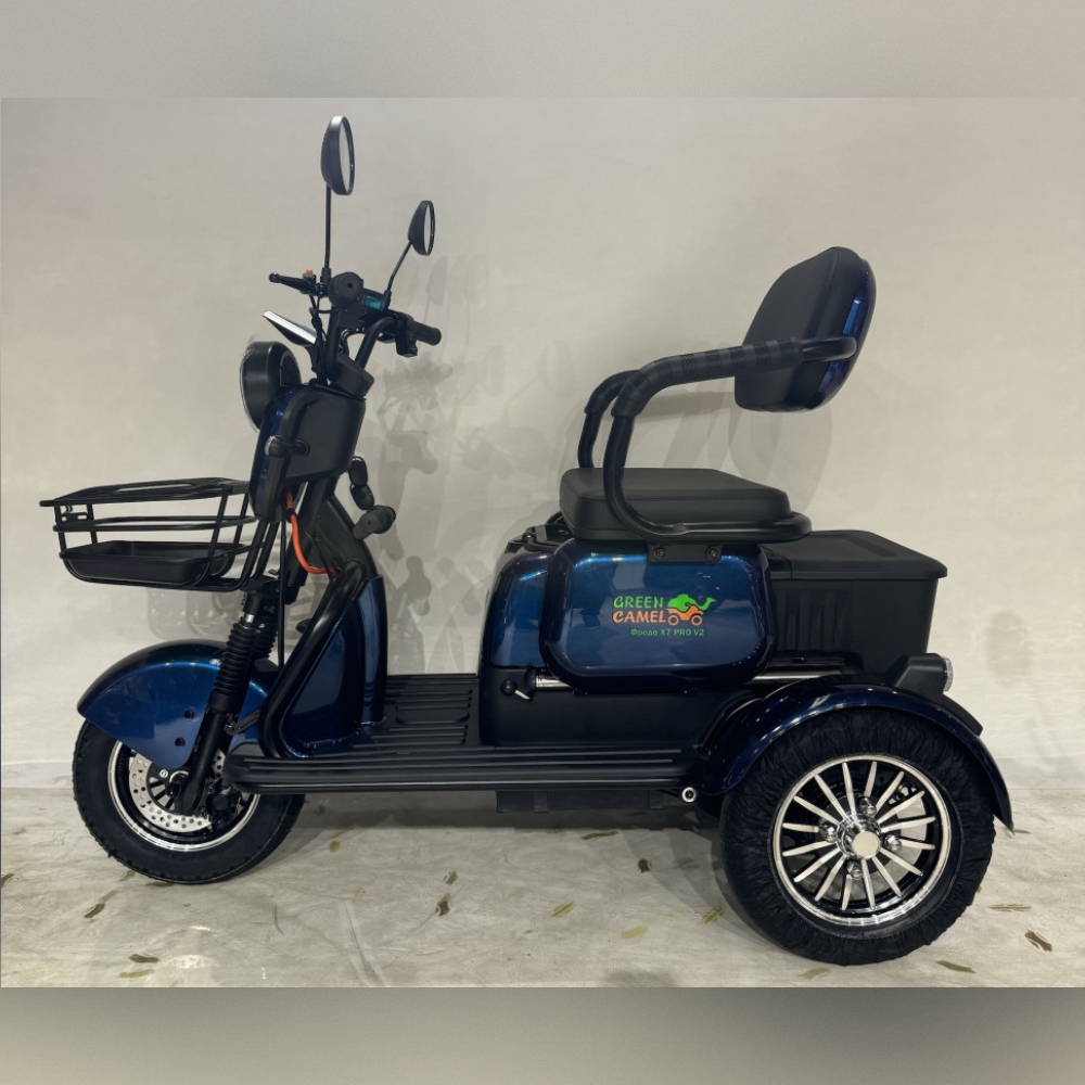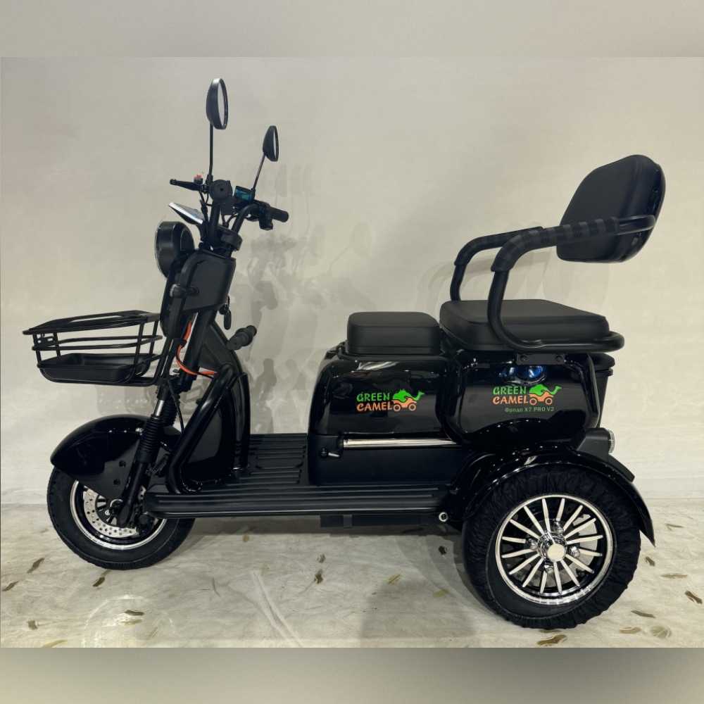 Вторая версия популярной модели. Покупатели высоко оценили базовую модель семейного электротрицикла — GreenCamel Фродо X7, в GreenCamel учли пожелания и представляем версию Фродо X7 PRO с колёсами увеличенного радиуса, бесщеточным двигателем мощностью 800Вт, дифференциалом для плавного и мягкого хода. Как и младшая модель трицикл Фродо X7 PRO путём нескольких манипуляций может трансформироваться из трицикла с широким креслом для водителя в семейный транспорт со сдвижным сиденьем для пассажира и раскладным сиденьем для ребёнка и дублирующими детскими рукоятками на рулевой стойке. В комплектацию трицикла входит передняя корзина и задний большой кофр под пассажирским сиденьем, а также ниши на рулевой колонке. Трицикл имеет амортизацию на каждом колесе для большего комфорта. Высокоэффективный передний дисковый гидравлический и задний барабанный тормоза, с удобным рычагом под правую ногу, отвечают за безопасные остановки. Дальность пробега на штатной гелевой SLA батарее с ёмкостью 20Ач до 40 км. Трицикл оснащен яркой светодиодной фарой с режимами дальнего и ближнего света, ходовыми огнями, поворотниками, стоп-сигналом, зеркалами заднего вида и может перемещаться по дорогам общего пользования при наличии водительского удостоверения и возрасте водителя старше 16 лет (согласно изменениям в ПДД с 1.03.23 г.). Скутер Фродо X7 PRO дополнительно оборудован USB разъёмом и сигнализацией с брелоком управления, так что вы не будете переживать за сохранность вашего индивидуального транспорта.