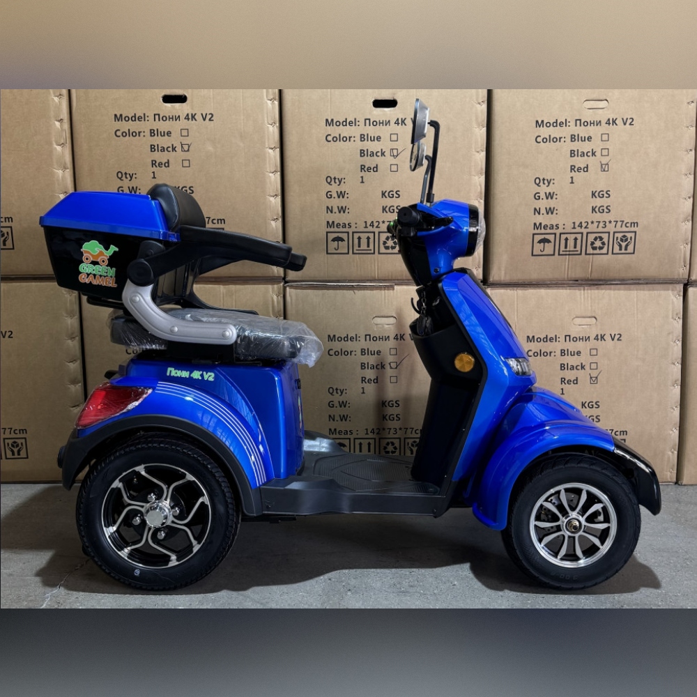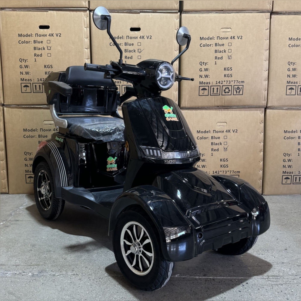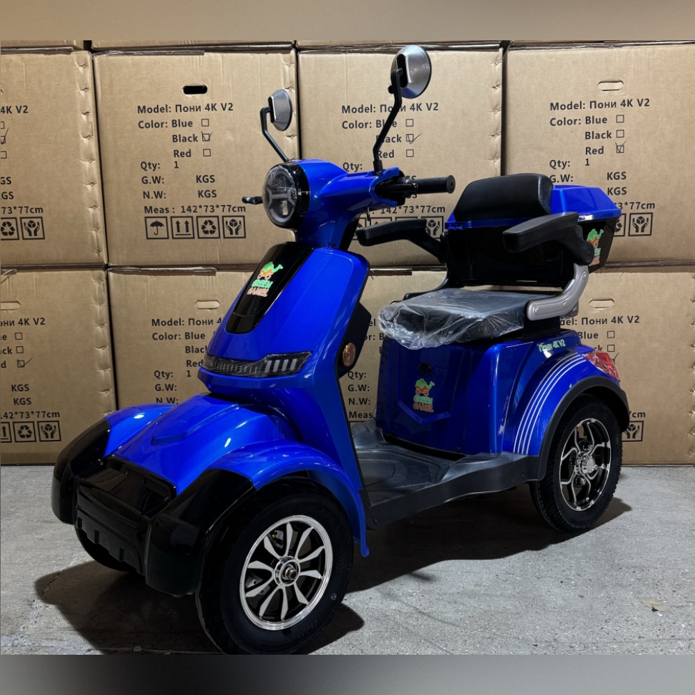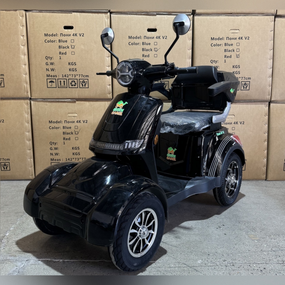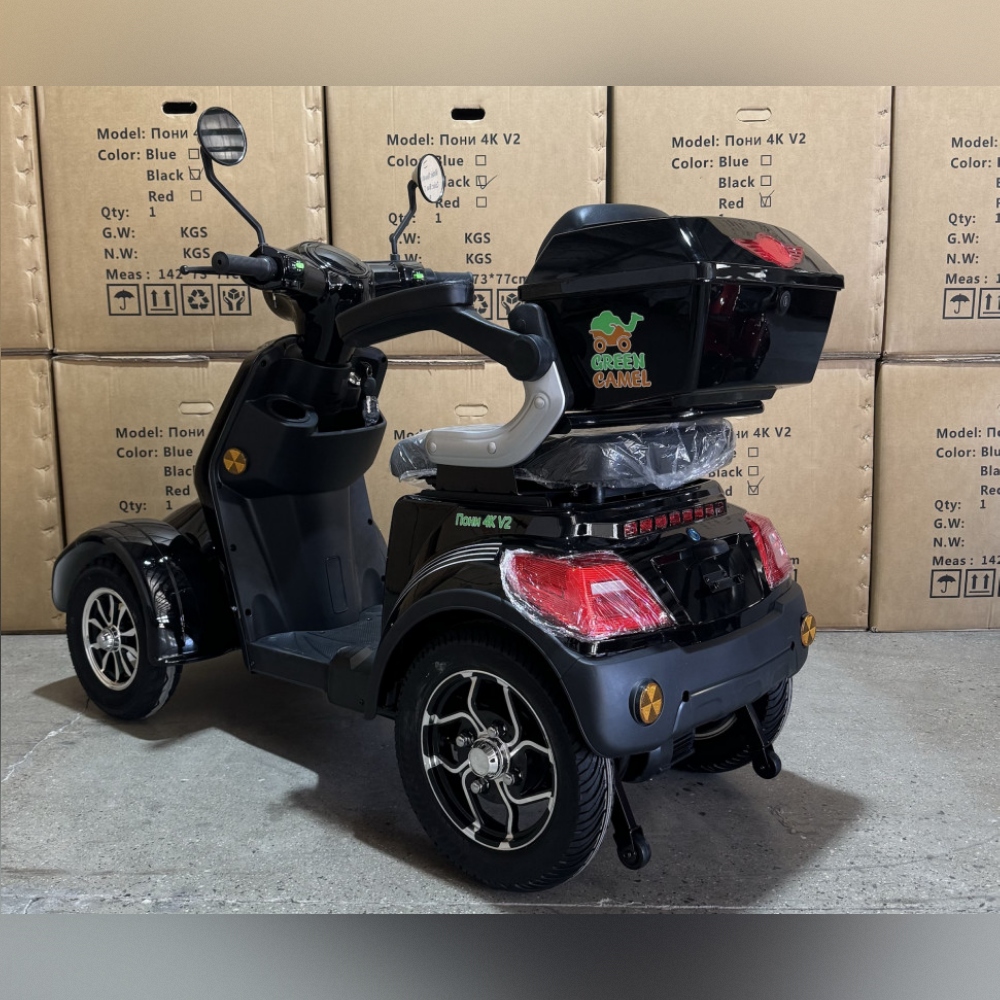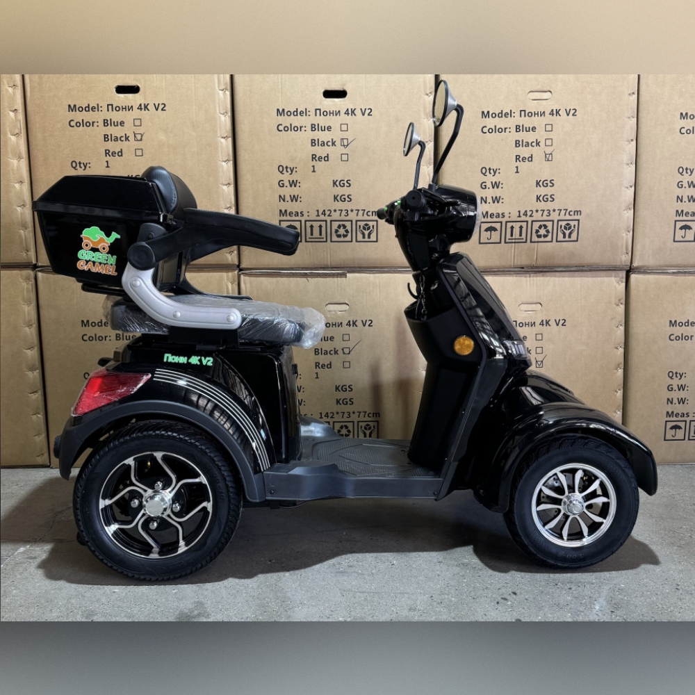 Ассортимент EcoMoto пополнился вместительной четырехколесной моделью электроскутера с широким креслом и подлокотниками для комфорта пожилых людей. Благодаря низкому центру тяжести, широкому расположению колёс Пони 4K обладает повышенной устойчивостью в поворотах, а клиренс в 20 см и мощный мотор придают модели высокую проходимость на различных поверхностях. Пони 4К оснащен яркой светодиодной фарой с режимами дальнего и ближнего света, поворотниками, стоп-сигналом, зеркалами заднего вида и может перемещаться на выделенной полосе дороги при наличии водительского удостоверения. В базовой комплектации уже есть прочный кофр для перевозки покупок и вещей, а передняя стойка дополнена подстаканником и нишей для мелочей. Пони 4К оборудован сигнализацией с брелоком управления, так что вы не будете переживать за сохранность вашего индивидуального транспорта.