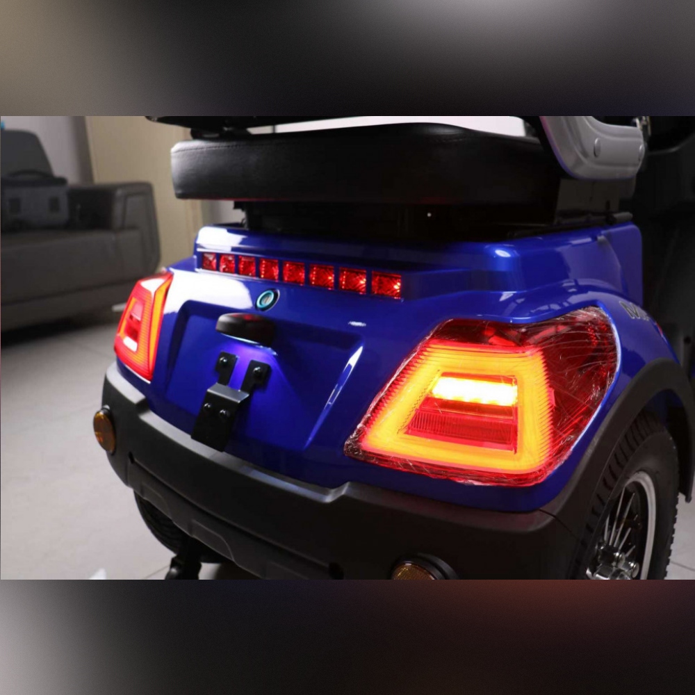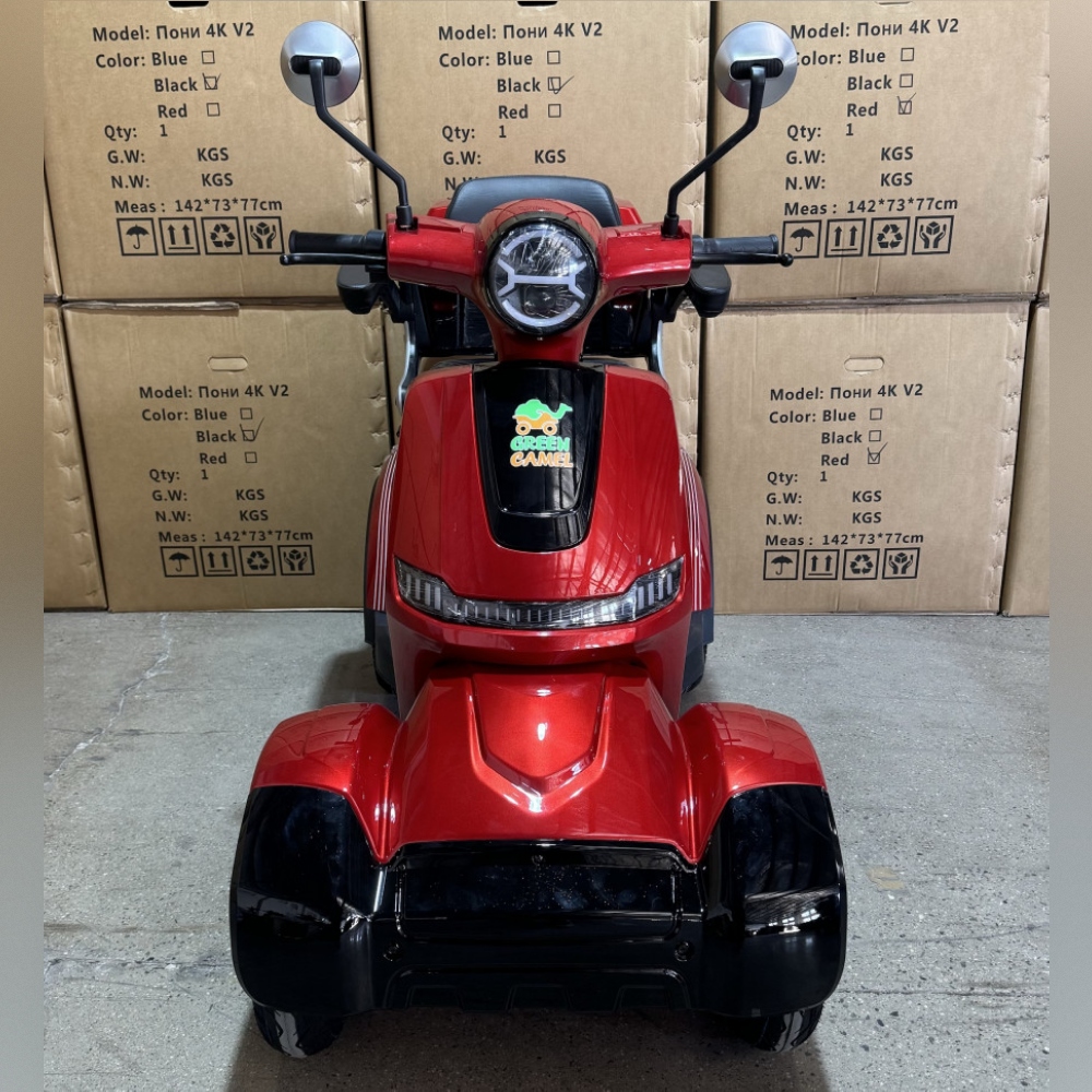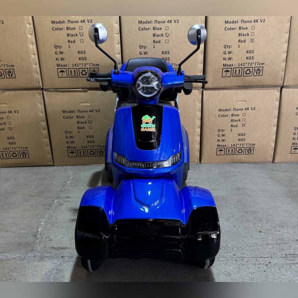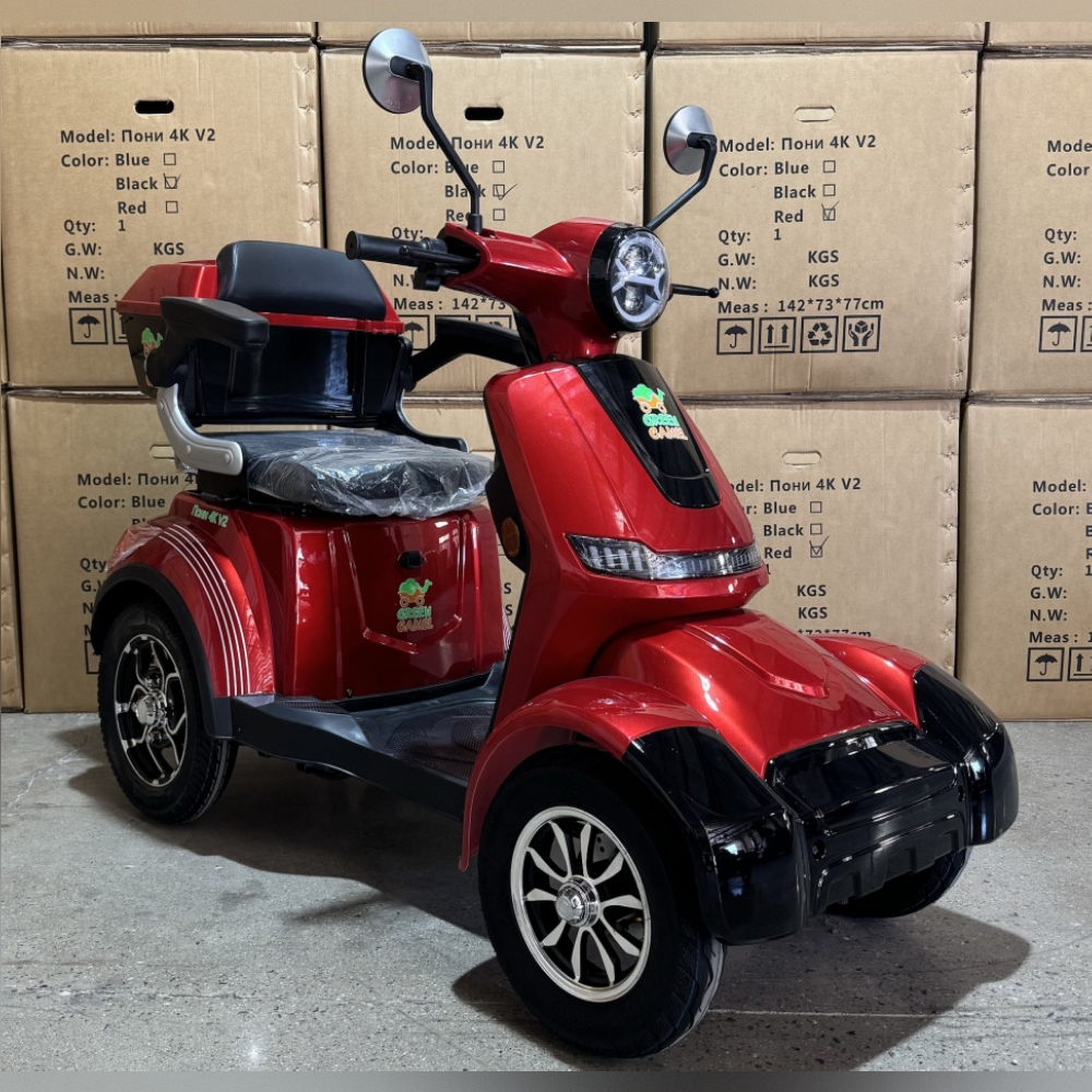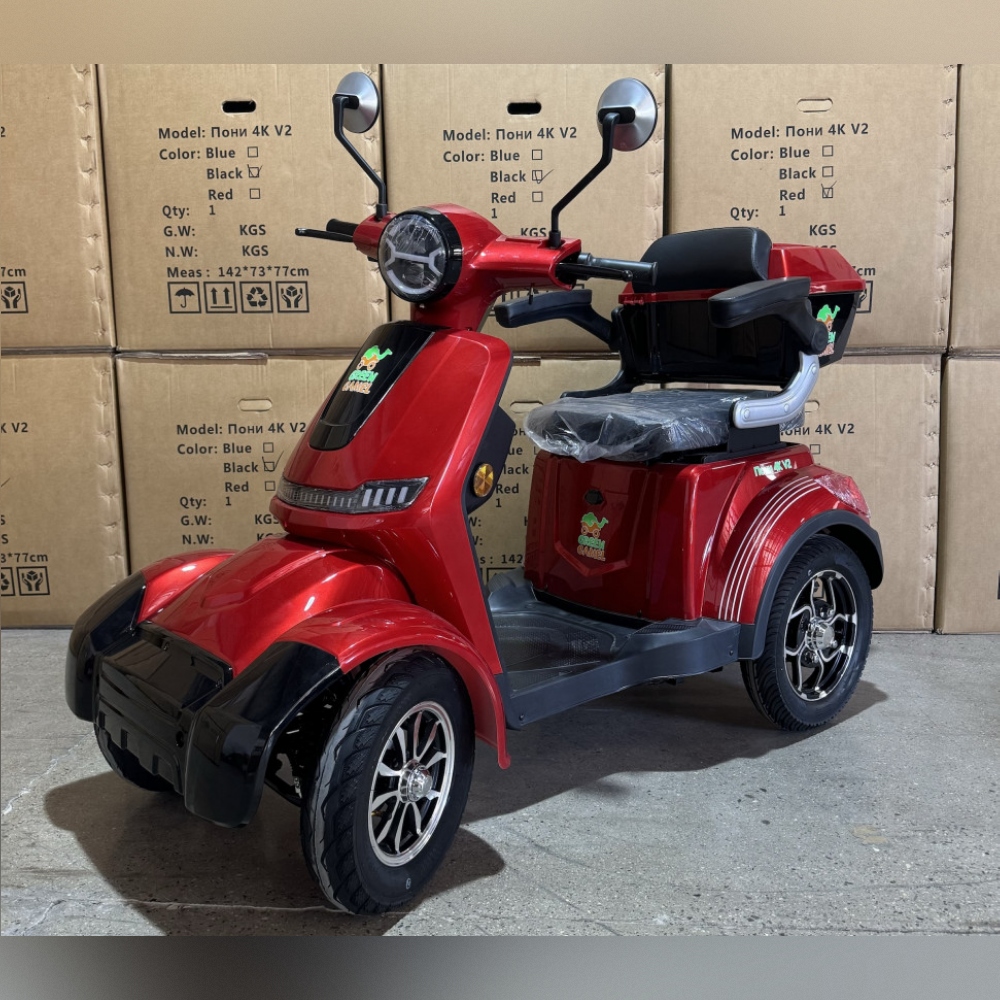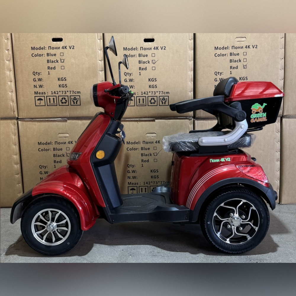 Ассортимент EcoMoto пополнился вместительной четырехколесной моделью электроскутера с широким креслом и подлокотниками для комфорта пожилых людей. Благодаря низкому центру тяжести, широкому расположению колёс Пони 4K обладает повышенной устойчивостью в поворотах, а клиренс в 20 см и мощный мотор придают модели высокую проходимость на различных поверхностях. Пони 4К оснащен яркой светодиодной фарой с режимами дальнего и ближнего света, поворотниками, стоп-сигналом, зеркалами заднего вида и может перемещаться на выделенной полосе дороги при наличии водительского удостоверения. В базовой комплектации уже есть прочный кофр для перевозки покупок и вещей, а передняя стойка дополнена подстаканником и нишей для мелочей. Пони 4К оборудован сигнализацией с брелоком управления, так что вы не будете переживать за сохранность вашего индивидуального транспорта.