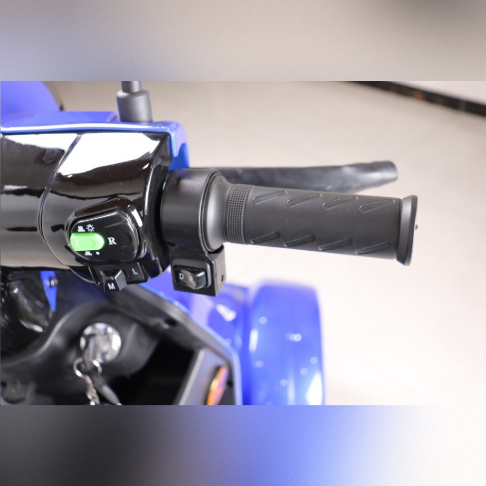 - Трехскоростной переключатель на правой рукоятке — 15,25,35 км/ч, переключатель заднего хода R;