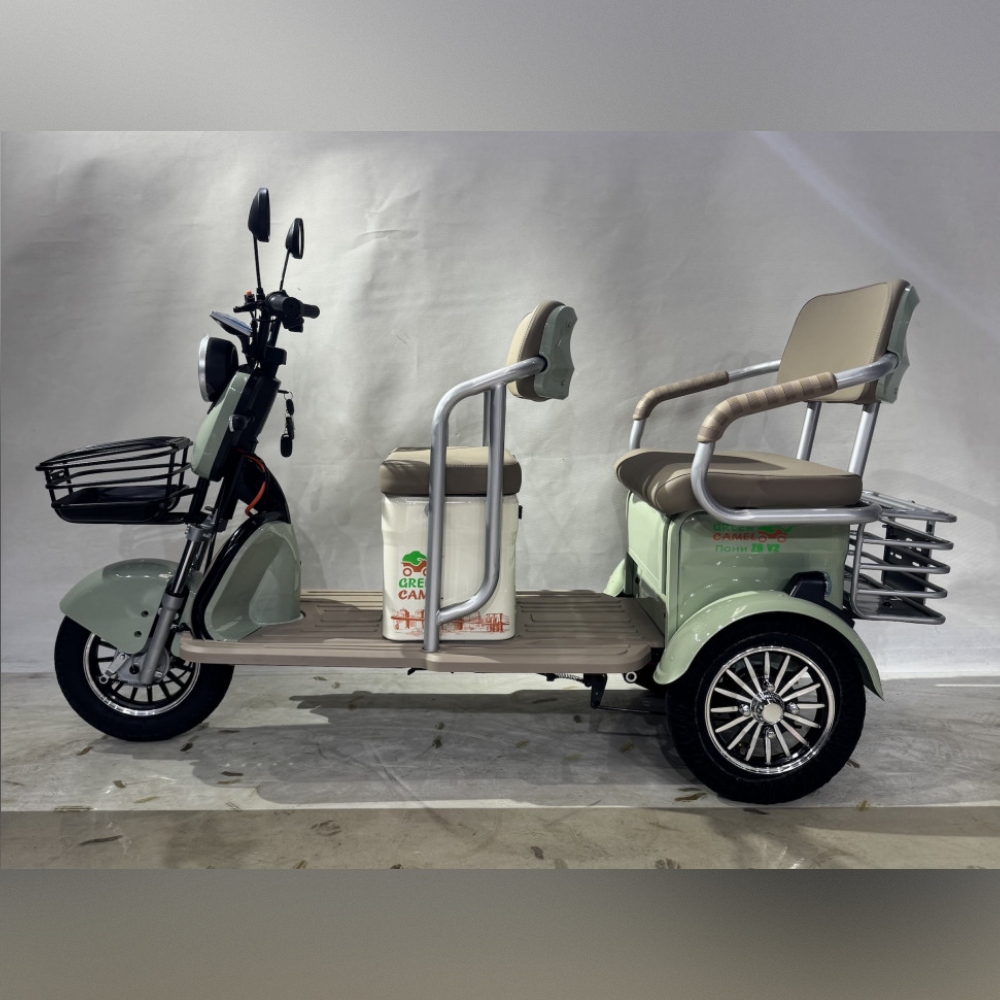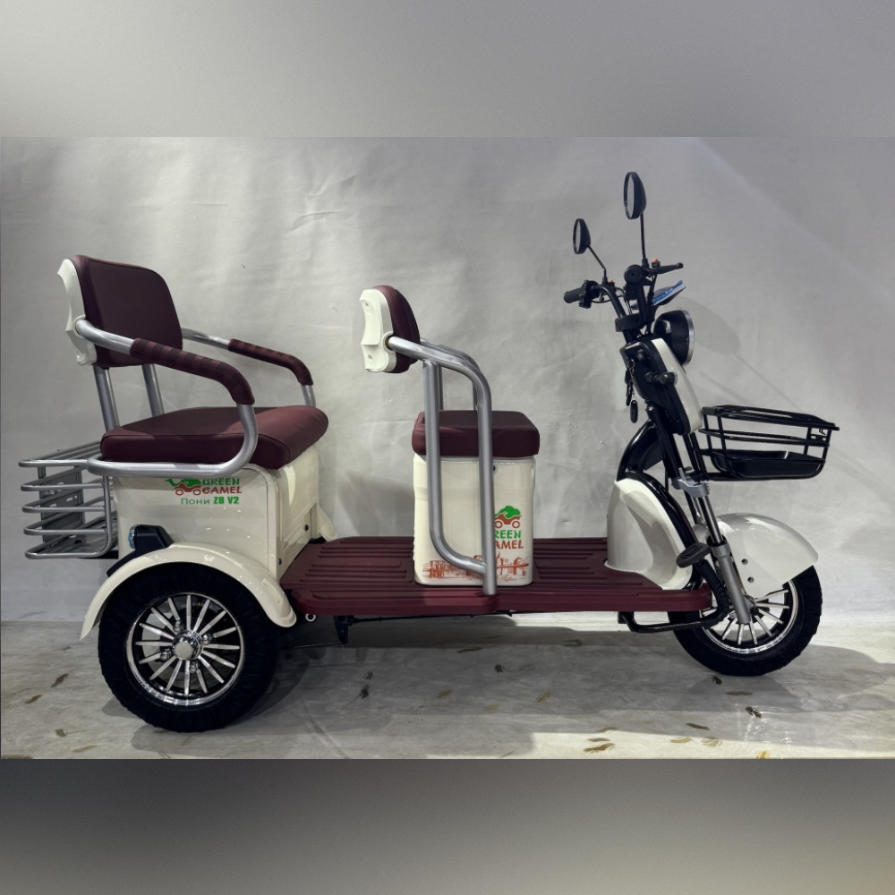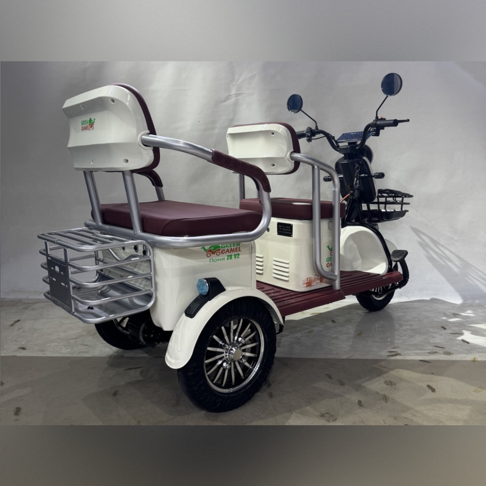 Модель электро трицикла GreenCamel Пони Z8 V2 (72V 1000W) будет интересна как семейный электротранспорт для регулярных поездок, так и коммерческий пассажирский электротранспорт для проката и катания на больших территориях предприятий, парков, отелей и зон отдыха. Трицикл оборудован широкими и комфортными мягкими сиденьями со спинкой для водителя и пассажира. Для небольших размеров у трицикла увеличенное количество багажных отсеков помимо передней и задней корзин под пассажирским сиденье имеется дополнительный багажные отсек. За счёт наличия дифференциалы трицикл имеет плавный ход, а надежный бесщёточный мотор мощностью 1000Вт и напряжением 72В в паре в гелевым SLA аккумулятором ёмкостью 20 Ач способен развивать скорость 45 км/ч и при максимальной загрузке в 150 кг и запасом хода до 50 км (полный запас хода зависит от рельефа, поверхности, режима езды, температуры и т.п.). Учитывая изменения в ПДД с 1.03.2023г., трицикл GreenCamel Пони Z8 оснащен яркой светодиодной фарой с режимами дальнего и ближнего света, ходовыми огнями, поворотниками, стоп-сигналом, зеркалами заднего вида и может перемещаться на выделенной полосе дороги или ДОП при наличии водительского удостоверения и возрасте водителя старше 16 лет. Трицикл Пони Z8 оборудован сигнализацией с брелоком управления, так что вы не будете переживать за сохранность вашего индивидуального транспорта.